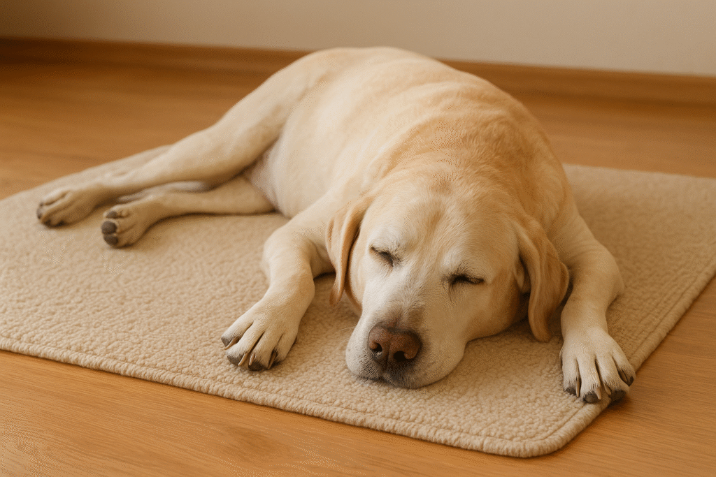 Resting peacefully, he shows that gentle care is the best medicine for every senior dog.