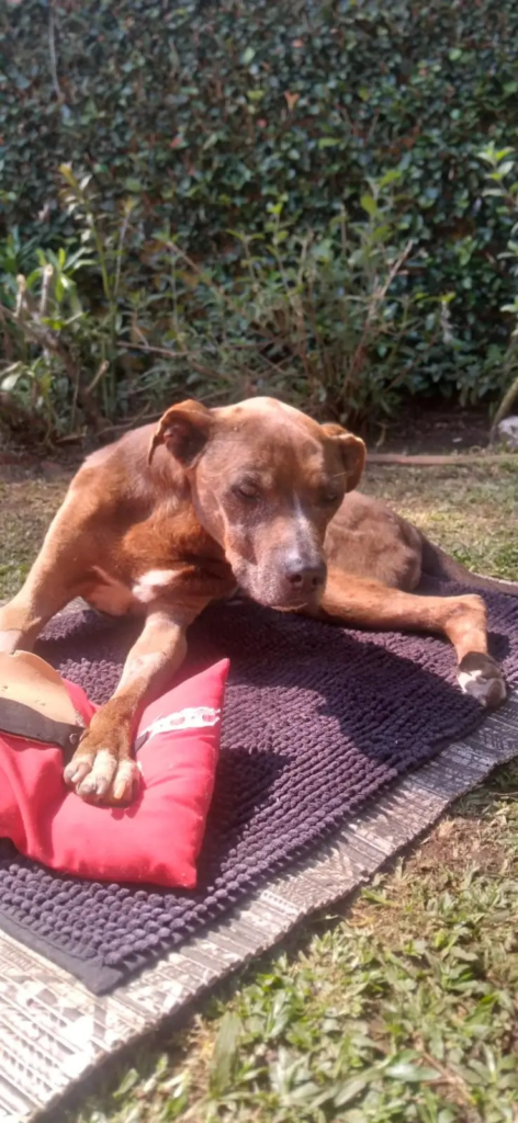 Dog after daily care and nutritional support, in an outdoor setting that is part of the routine.