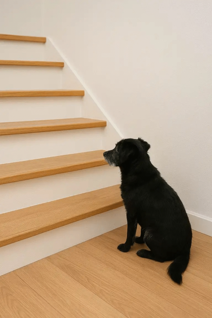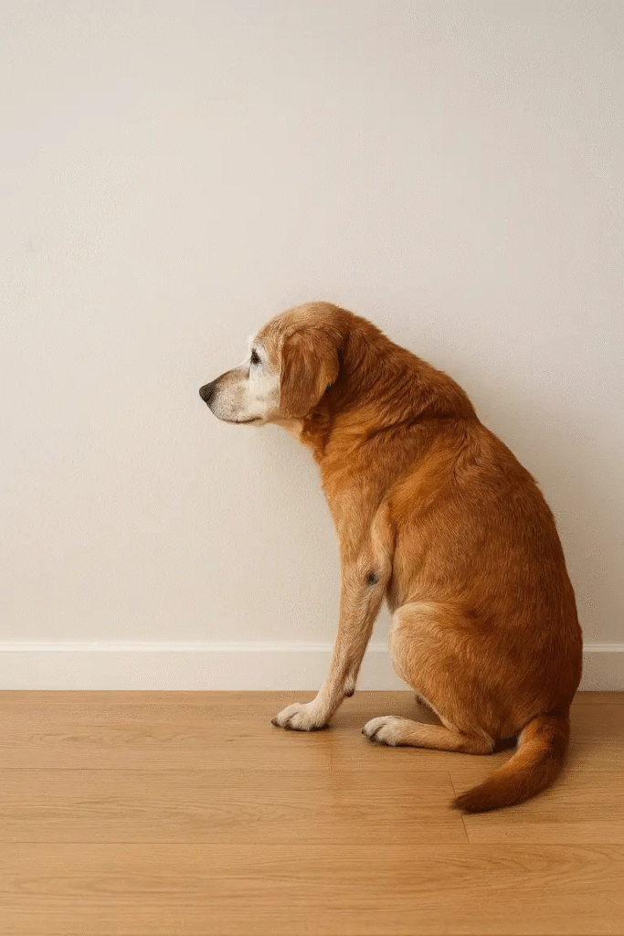 - Disorientation — the dog appears lost in familiar places and may stare blankly at walls or corners.