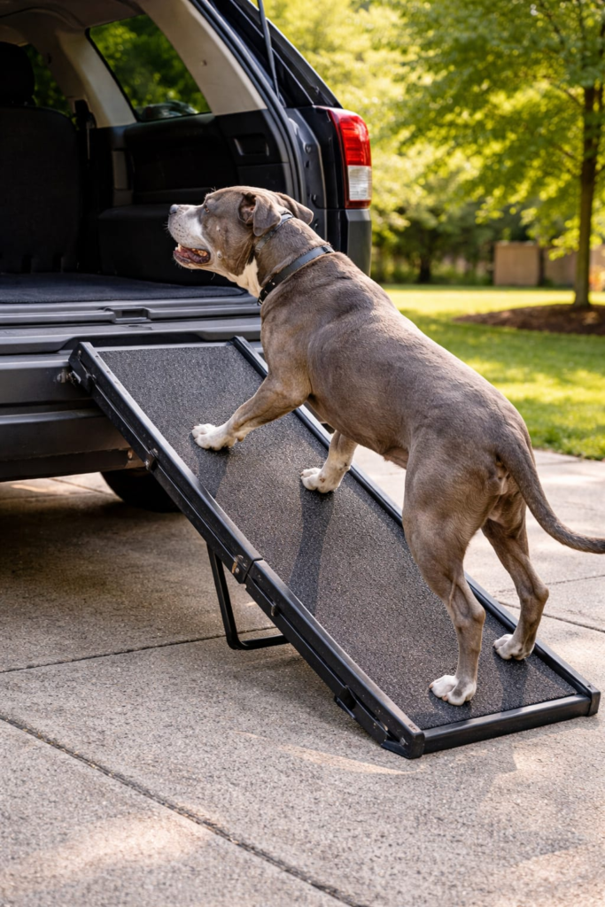 Because jumping into the vehicle became difficult, a ramp was introduced to make the movement safer and more comfortable. Instead of forcing the dog to jump or climb, the ramp allowed gradual walking into the car.
